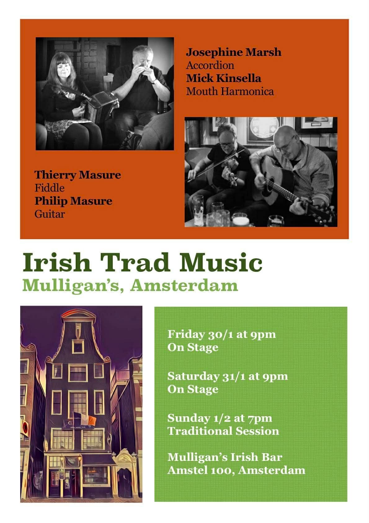 | 20/02/2026 | Malin | We’re thrilled to welcome MALIN back to Mulligans! - Judith Kolen (fiddle) – Mariëtte van Kooten (accordion) – Theo Burghouts (Irish bouzouki, guitar) – Onno Kuipers (accordion, guitar, mandolin, trekharmonica) |